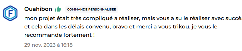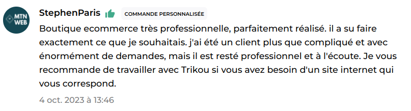 Sous le pseudonyme Trikou, notre agence AssureDevs a reçu 32 avis positifs sur ComeUp, sans une seule note négative. Ces retours confirment notre expertise et notre dévouement à offrir des solutions web sur mesure qui répondent parfaitement aux attentes de nos clients. Trikou est plus qu’un profil, c’est le reflet de notre engagement envers l’excellence.
